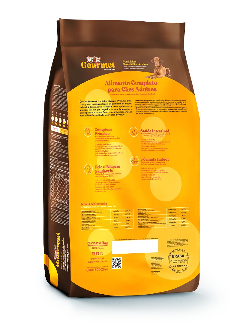 Quatree gourmet é o único alimento Premium Plus com quatro excelentes fontes de proteínas de origem animal e ingredientes especiais para aprimorar a nutrição do seu pet. Superior na sua formulação e incomparável no sabor, Quatree gourmet proporciona uma vida mais saudável e alegre para o seu cão.