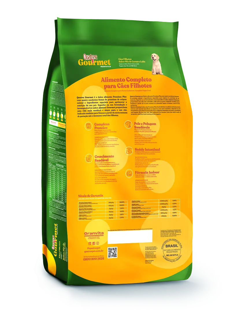 Quatree gourmet é o único alimento Premium Plus com quatro excelentes fontes de proteínas de origem animal e ingredientes especiais para aprimorar a nutrição do seu pet. Superior na sua formulação e incomparável no sabor, Quatree gourmet proporciona uma vida mais saudável e alegre para o seu cão.