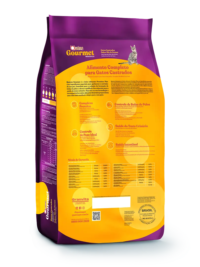 Quatree gourmet é o único alimento Premium Plus com ingredientes especiais para aprimorar a nutrição do seu pet. Contribui para a redução da formação de bolas de pelos e oferece equilíbrio dos minerais para a saúde do trato urinário. Superior na sua formulação e incomparável no sabor, Quatree gourmet proporciona uma vida mais saudável e alegre para o seu gato.