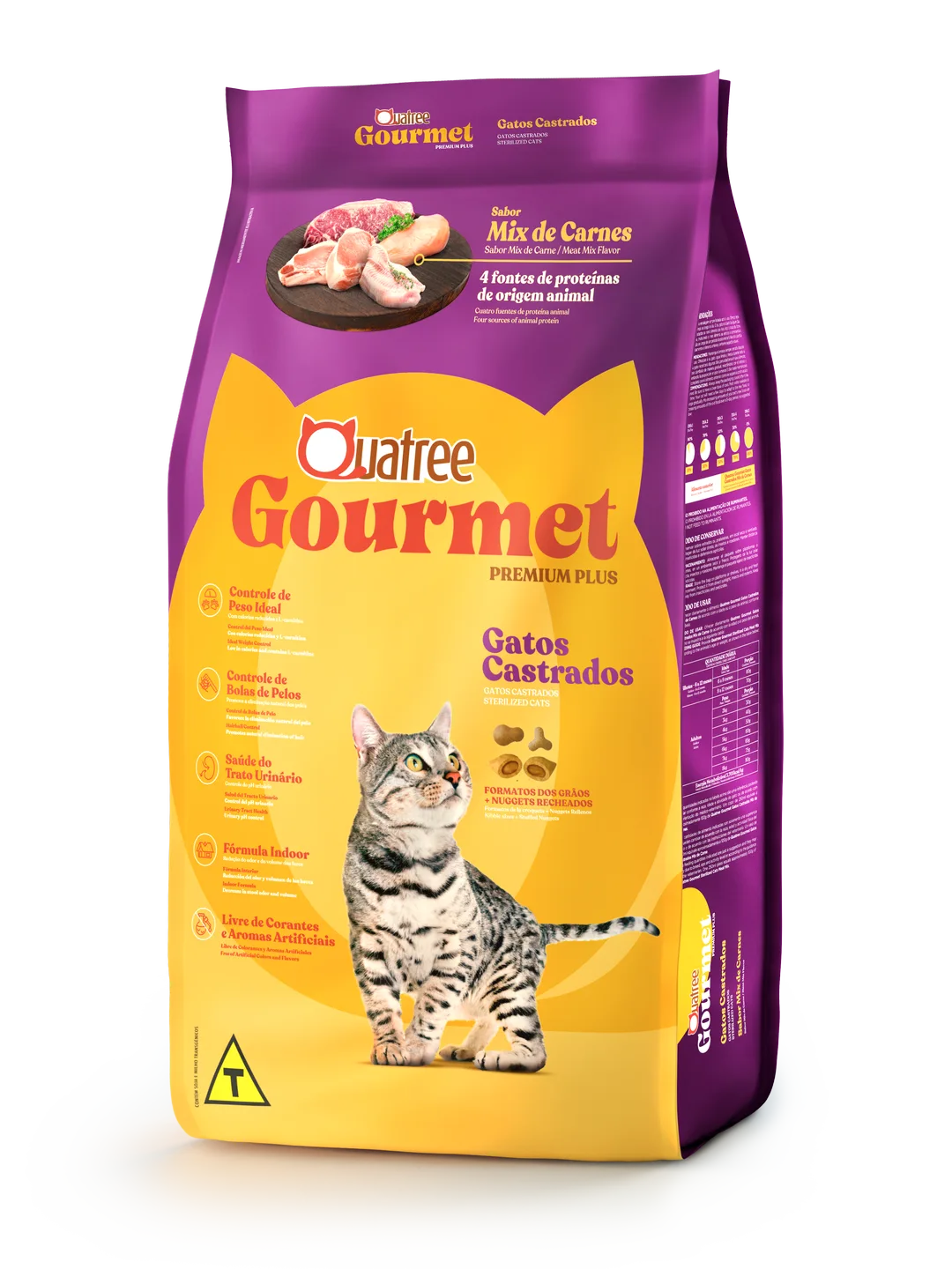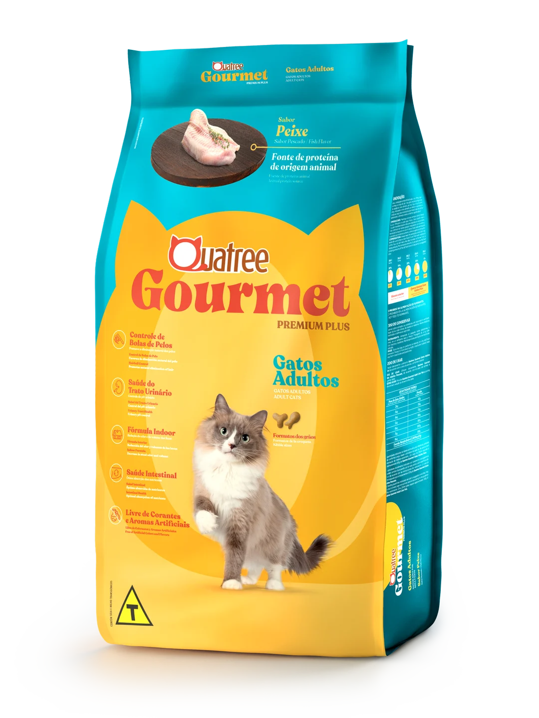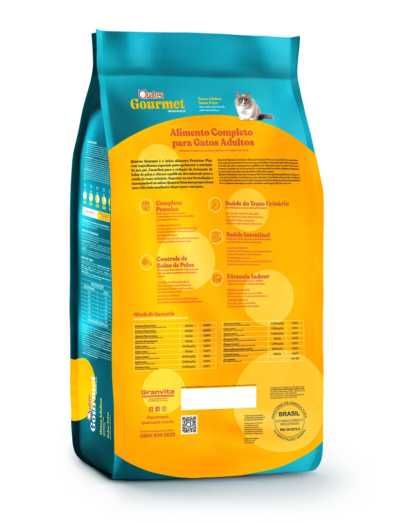 Quatree gourmet é o único alimento Premium Plus com ingredientes especiais para aprimorar a nutrição do seu pet. Contribui para a redução da formação de bolas de pelos e oferece equilíbrio dos minerais para a saúde do trato urinário. Superior na sua formulação e incomparável no sabor, Quatree gourmet proporciona uma vida mais saudável e alegre para o seu gato.
