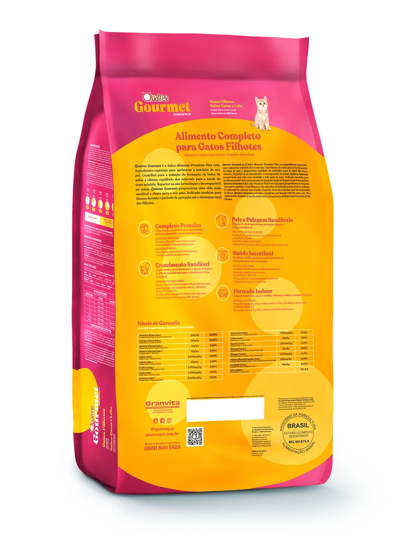 Quatree gourmet é o único alimento Premium Plus com ingredientes especiais para aprimorar a nutrição do seu pet. Contribui para a redução da formação de bolas de pelos e oferece equilíbrio dos minerais para a saúde do trato urinário. Superior na sua formulação e incomparável no sabor, Quatree gourmet proporciona uma vida mais saudável e alegre para o seu gato.