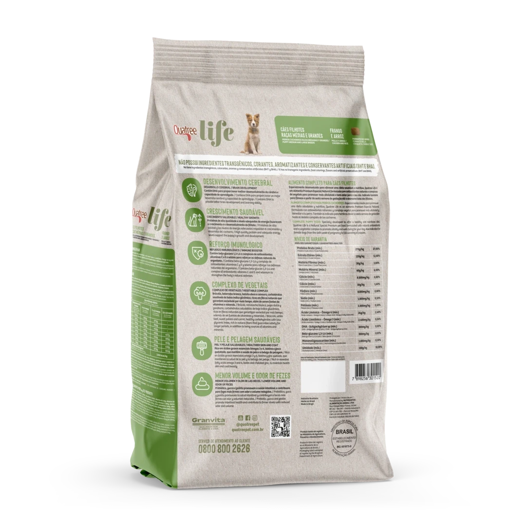 Especialmente desenvolvido para oferecer uma dieta saudável e nutritiva, Quatree life é um alimento Premium Especial Natural formulado com antioxidantes naturais e complexo de vegetais para promover mais vitalidade e bem-estar para o seu cão.