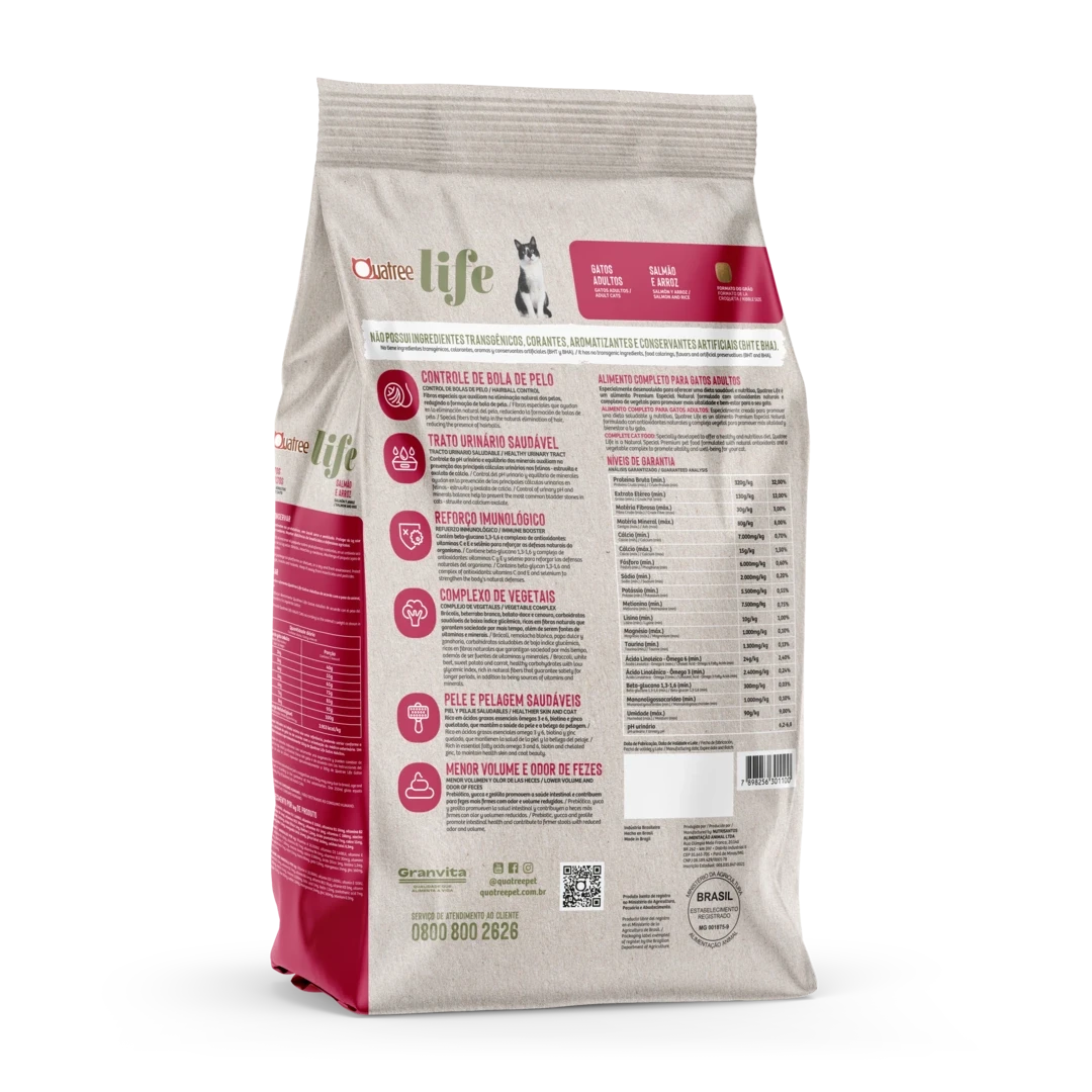 Quatree life Gatos Adultos é especialmente desenvolvido para oferecer uma dieta saudável e nutritiva. Quatree life é um alimento Premium Especial Natural formulado com antioxidantes naturais e complexo de vegetais para promover mais vitalidade e bem-estar para o seu gato. Não possui ingredientes transgênicos, corantes, aromatizantes e conservantes artificiais (BHT e BHA).