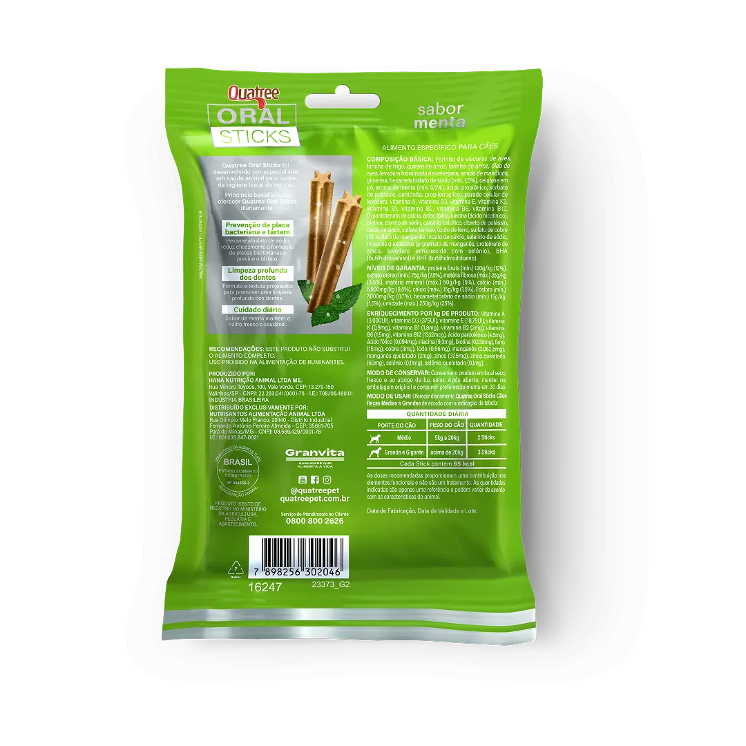 A higiene bucal é muito importante para uma vida mais saudável. Quatree Oral Sticks é uma forma saborosa e eficaz de reduzir a formação de placas bacterianas. Contém hexametafosfato de sódio para o controle de tártaro. Seu formato, textura e sabor de menta promovem uma limpeza profunda dos dentes e mantêm o hálito fresco.