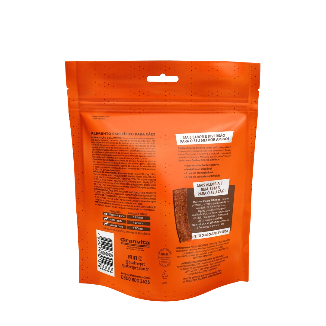 Quatree Snacks Bifinhos é uma delícia de petisco feito com ingredientes especiais que o seu cão vai adorar! Saboroso e nutritivo, é indicado para cães de todas as idades. Quatree Snacks Bifinhos contém prebiótico e zeólita para auxiliar no equilíbrio da flora intestinal, colágeno para manter a pele saudável e macia e hexametafosfato de sódio para reduzir a formação de tártaro e mau hálito. Quatree Snacks Bifinhos alimenta e faz a alegria do seu cão!