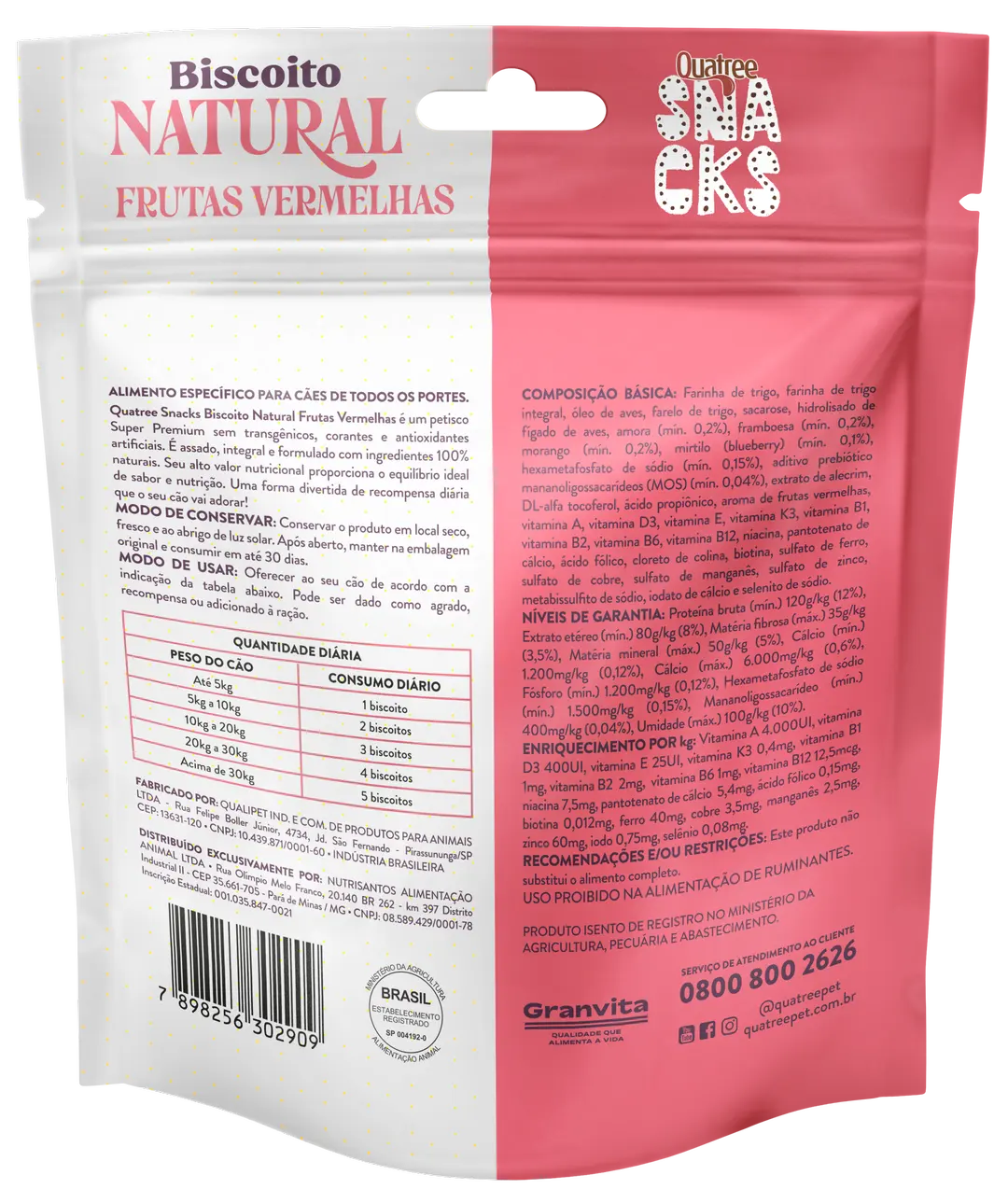 Quatree Snacks Biscoito Natural Frutas Vermelhas é um petisco Super Premium sem transgênicos, corantes e antioxidantes artificiais. É assado, integral e formulado com ingredientes 100% naturais. Seu alto valor nutricional proporciona o equilíbrio ideal de sabor e nutrição. Uma forma divertida de recompensa diária que o seu cão vai adorar!