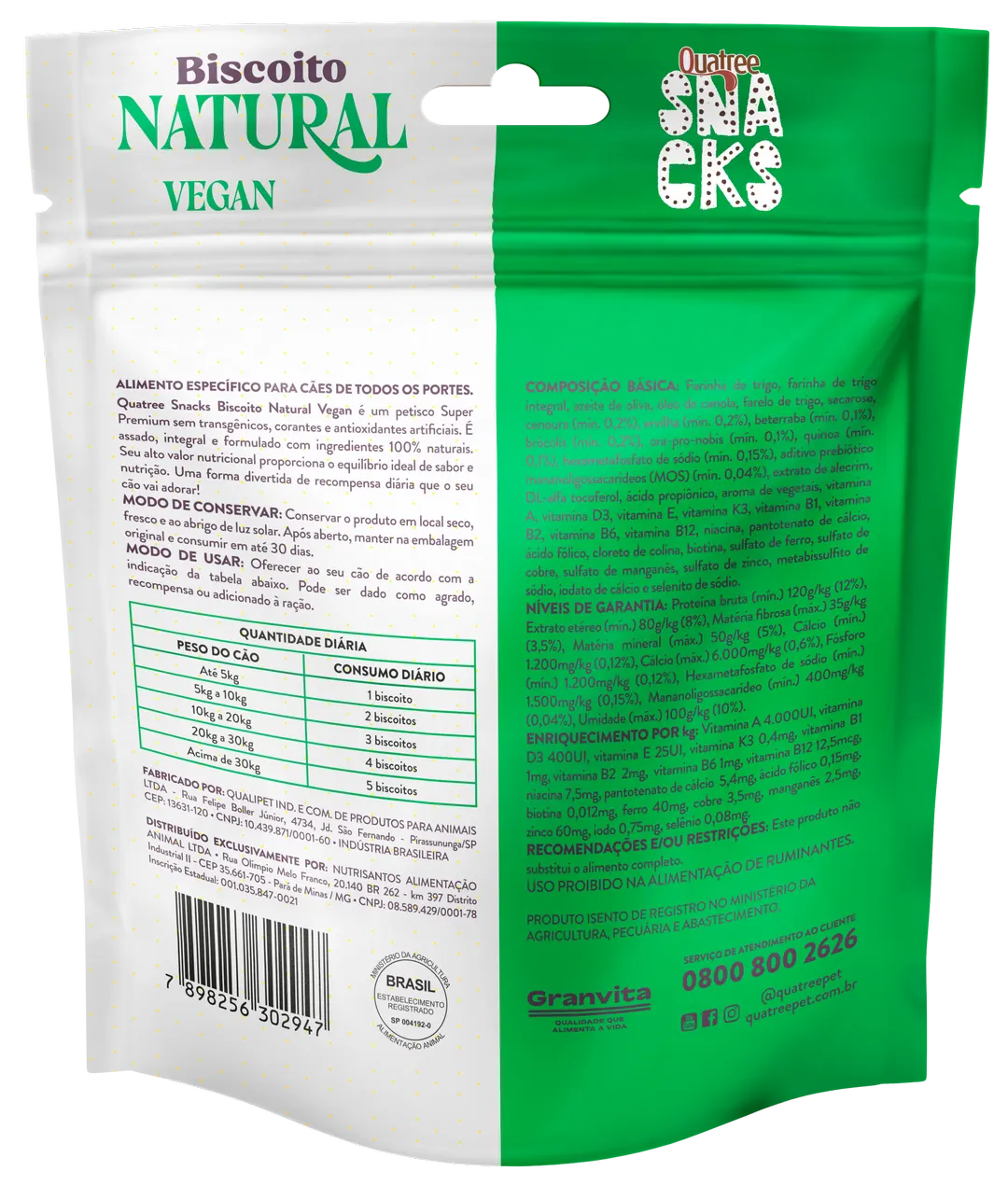 Quatree Snacks Biscoito Natural Vegan é um petisco Super Premium sem transgênicos, corantes e antioxidantes artificiais. É assado, integral e formulado com ingredientes 100% naturais. Seu alto valor nutricional proporciona o equilíbrio ideal de sabor e nutrição. Uma forma divertida de recompensa diária que o seu cão vai adorar!
