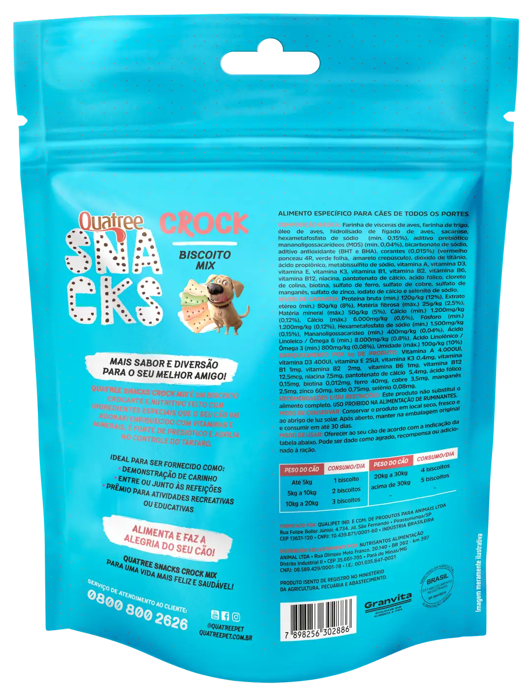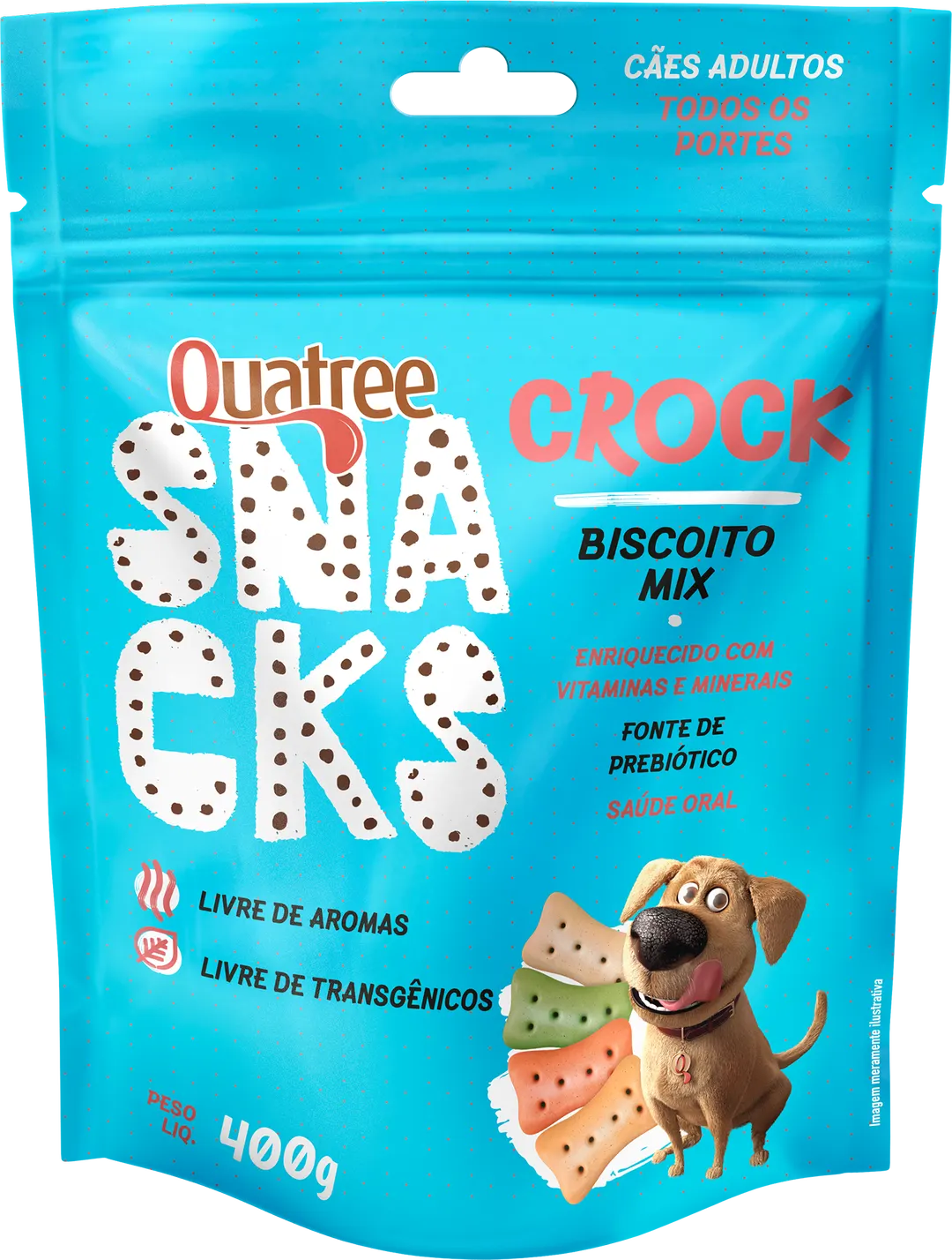 Quatree Snacks Crock Mix é um biscoito crocante e nutritivo feito com ingredientes especiais que o seu cão vai adorar! Enriquecido com vitaminas e minerais, é fonte de prebiótico e auxilia no controle do tártaro.