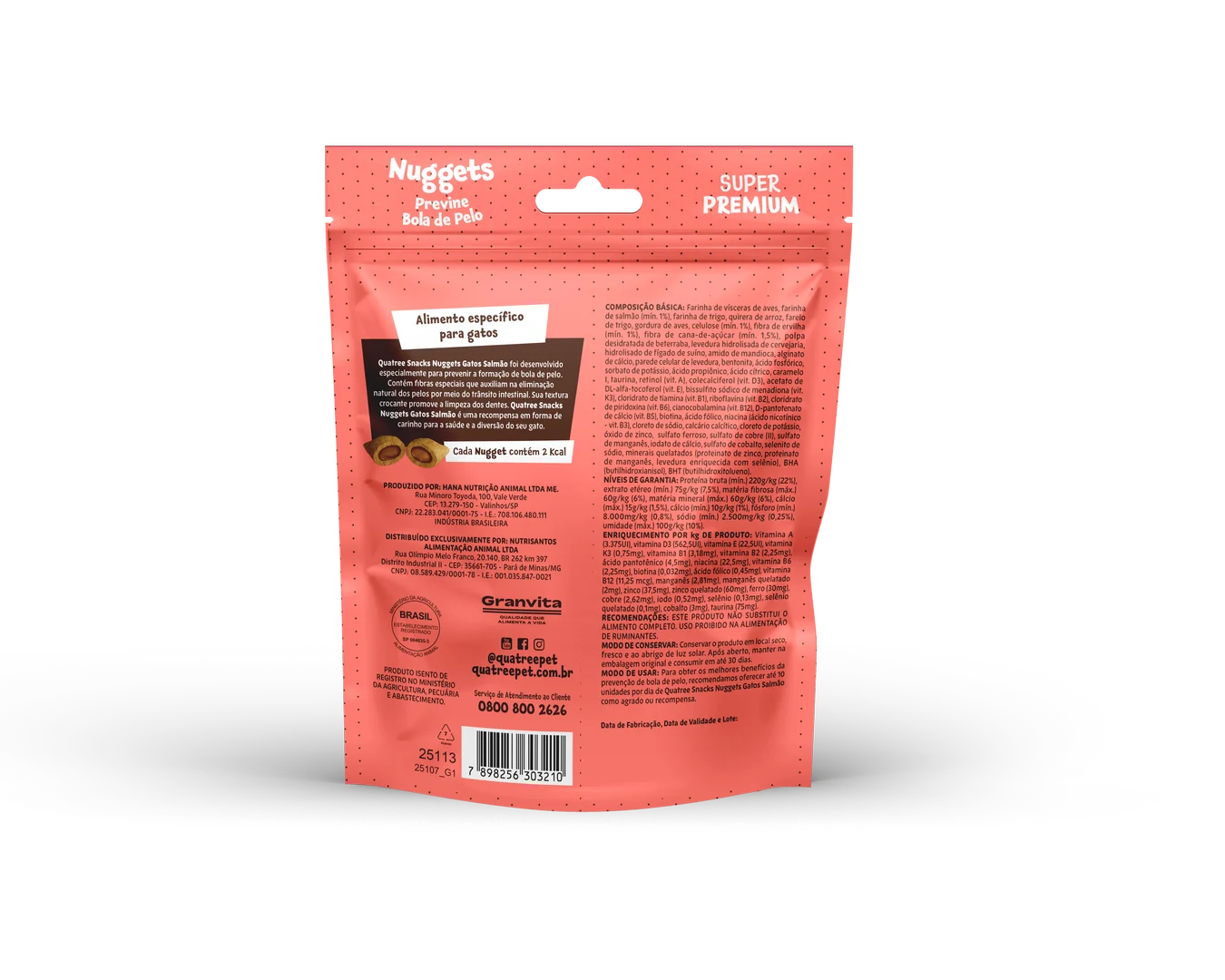 Quatree Snacks Nuggets Gatos foi desenvolvido especialmente para prevenir a formação de bola de pelo. Contém fibras especiais que auxiliam na eliminação natural dos pelos por meio do trânsito intestinal. Sua textura crocante promove a limpeza dos dentes. Quatree Snacks Nuggets Gatos é uma recompensa em forma de carinho para a saúde e a diversão do seu gato.