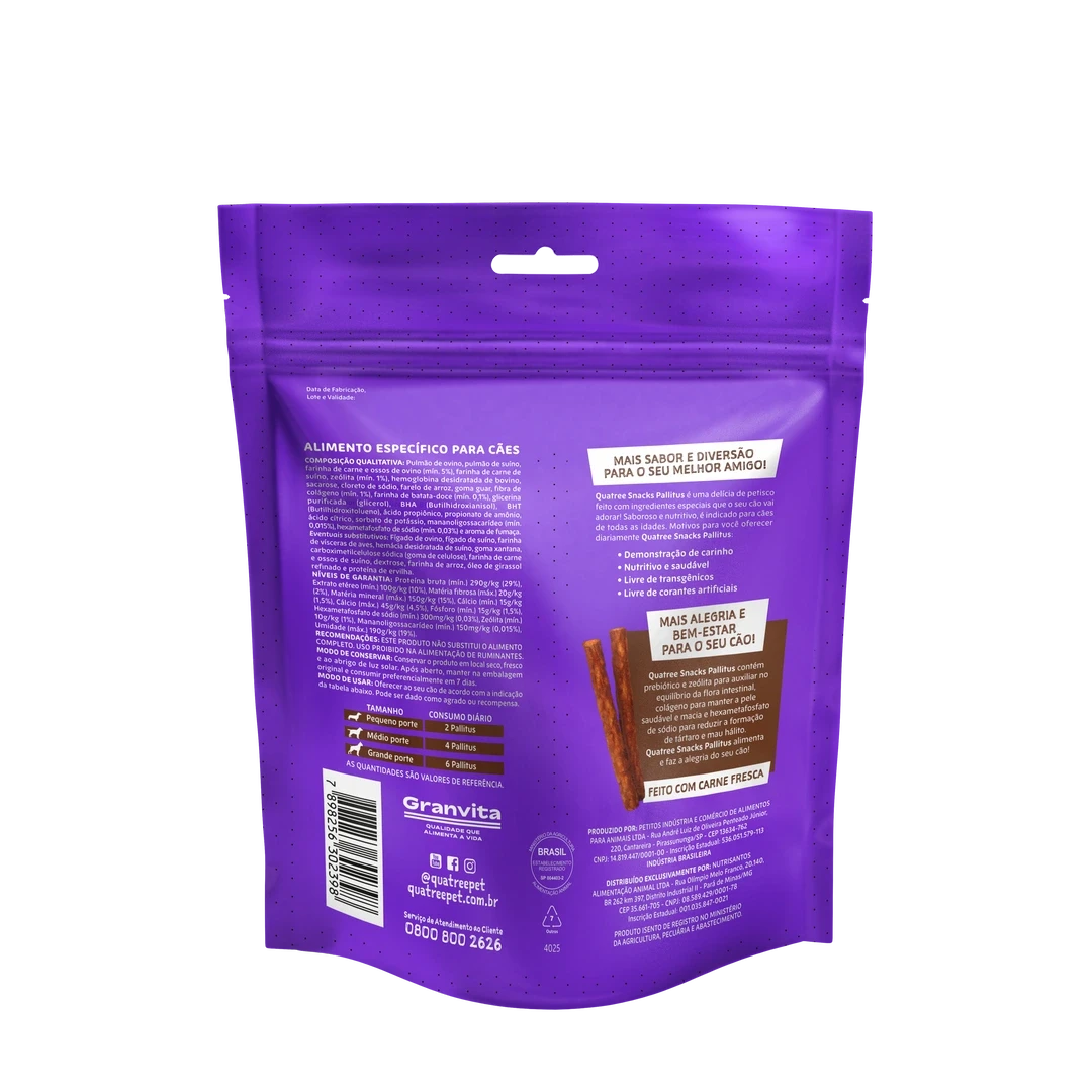 Quatree Snacks Pallitus é uma delícia de petisco feito com ingredientes especiais que o seu cão vai adorar! Saboroso e nutritivo, é indicado para cães de todas as idades. Quatree Snacks Pallitus contém prebiótico e zeólita para auxiliar no equilíbrio da flora intestinal, colágeno para manter a pele saudável e macia e hexametafosfato de sódio para reduzir a formação de tártaro e mau hálito. Quatree Snacks Pallitus alimenta e faz a alegria do seu cão!