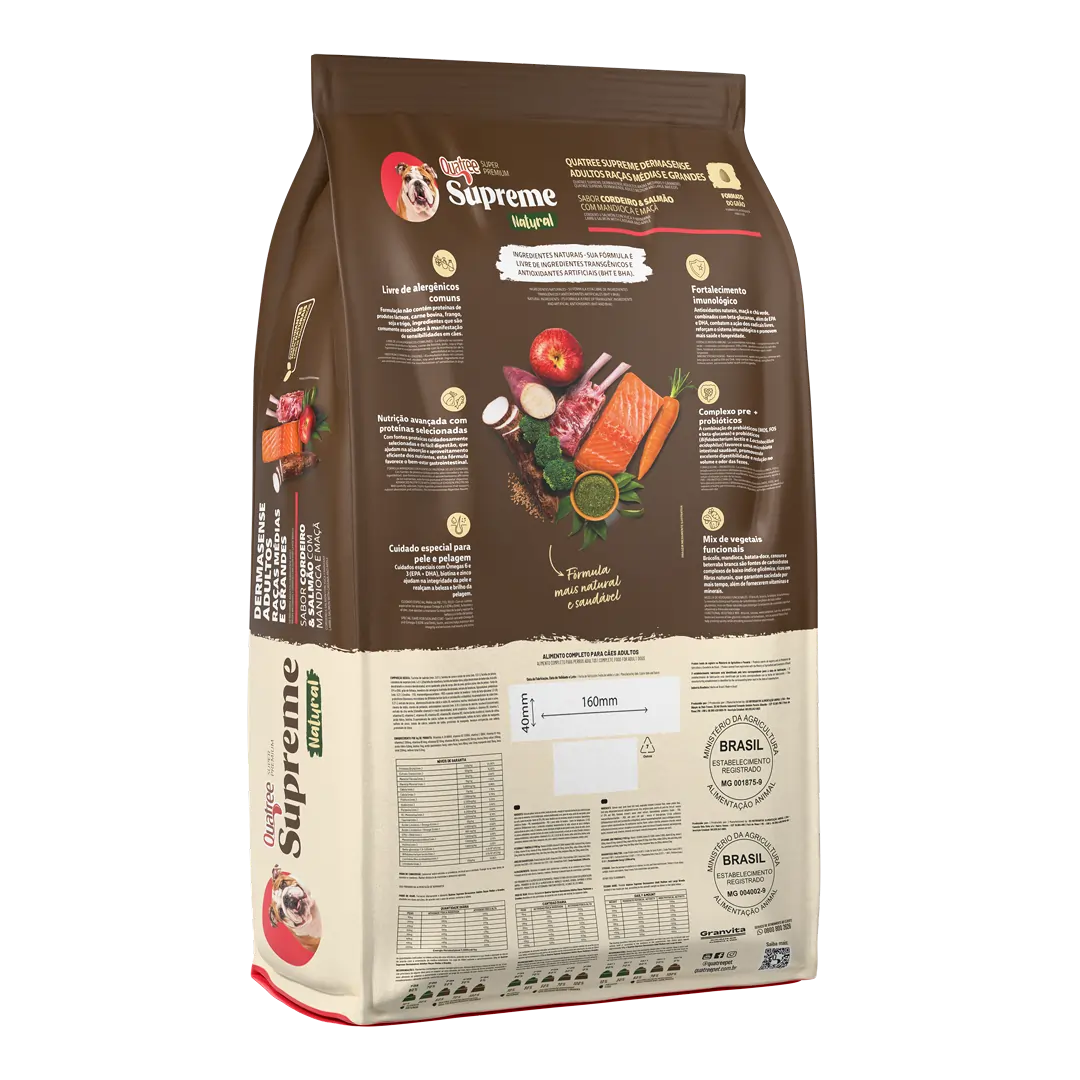Quatree supreme Adultos Dermato é um alimento Super Premium formulado com conservantes 100% naturais e livre de transgênicos, garantindo fácil digestão e absorção dos nutrientes. A combinação de proteínas selecionadas e ingredientes naturais e funcionais garante mais saúde e vitalidade para o seu cão.