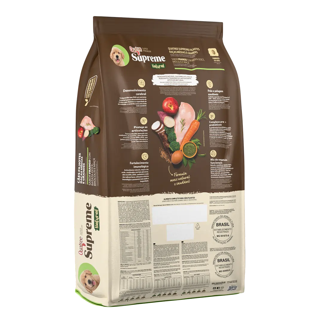 Quatree supreme Filhotes Raças Médias e Grandes é um alimento Super Premium formulado com conservantes 100% naturais e livre de transgênicos, garantindo fácil digestão e absorção dos nutrientes. A combinação de proteínas selecionadas e ingredientes naturais e funcionais garante mais saúde e vitalidade para o seu cão. Indicado também para fêmeas a partir da sexta semana de gestação até o desmame total dos filhotes.