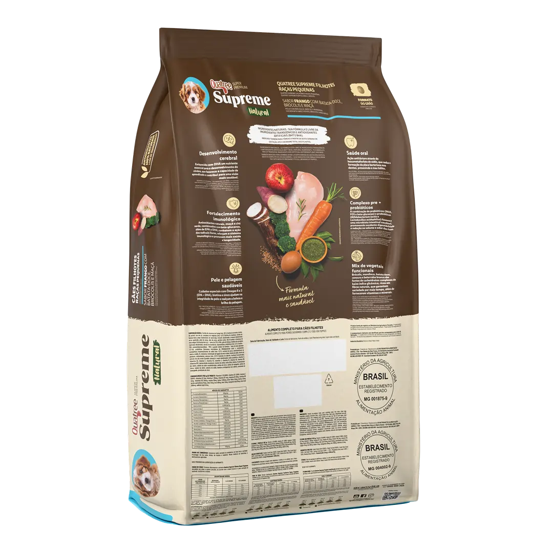 Quatree supreme Filhotes Raças Pequenas é um alimento Super Premium formulado com conservantes 100% naturais e livre de transgênicos, garantindo fácil digestão e absorção dos nutrientes. A combinação de proteínas selecionadas e ingredientes naturais e funcionais garante mais saúde e vitalidade para o seu cão.