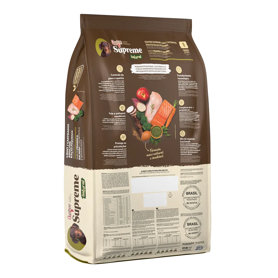 Alimento Super Premium formulado com conservantes 100% naturais e livre de transgênicos, garantindo fácil digestão e absorção dos nutrientes. A combinação de proteínas selecionadas e ingredientes naturais e funcionais ajuda a diminuir e controlar o peso de cães com tendência a engordar, castrados ou com baixa atividade física.