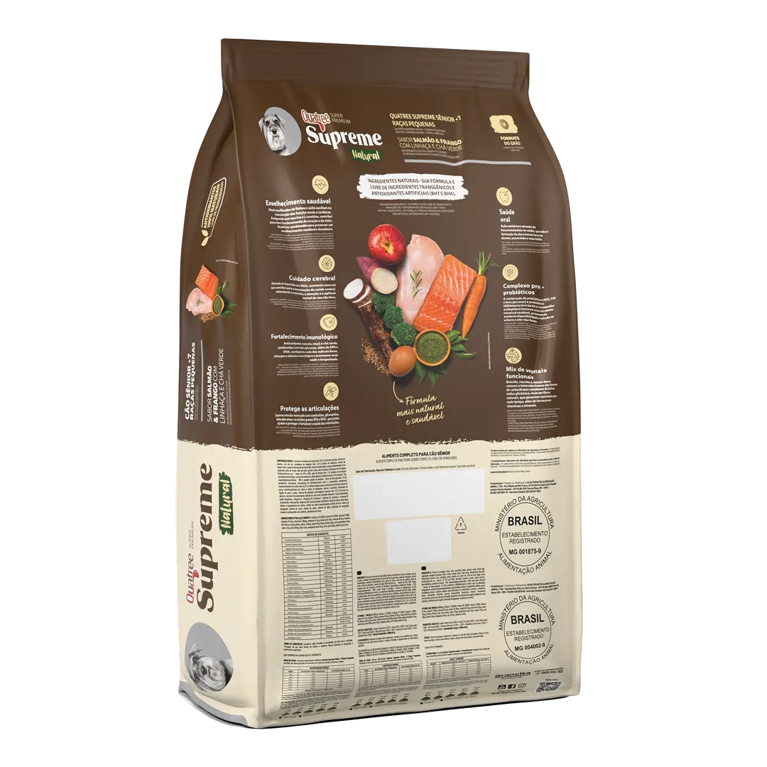 Quatree supreme Sênior +7 Raças Pequenas é um alimento Super Premium formulado com conservantes 100% naturais e livre de transgênicos, garantindo fácil digestão e absorção dos nutrientes. A combinação de proteínas selecionadas e ingredientes naturais e funcionais garante mais saúde e longevidade para o seu cão.